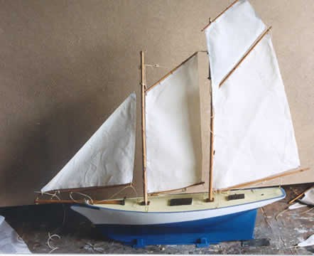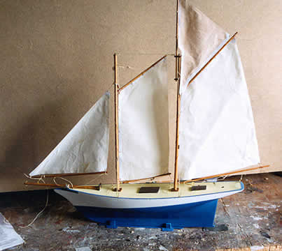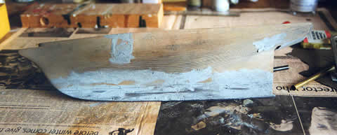 The Paxton Legacy, Part II The second of the Paxton toy boat hulls that I set out to restore was the schooner. This, though half as long again as the small cutter described in the article elsewhere on the site, had the same two pound displacement and was a much finer boned and rather elegant design. The construction was slightly different, in that though the main hull was carved out of a single piece, there was a lower portion to form the false keel and deadwood. I imagine this was to economically accommodate the considerable drag of the keel, which itself was called for by the use of a schooner rig, with its large mainsail mounted well aft. The hull had suffered a lot, both in the manufacturing process and during its century of waiting for someone to come along and rescue it.