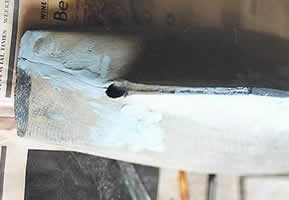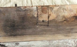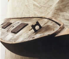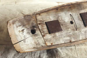There was a crude repair in the topsides, probably where the gouge had gone through as the interior was being carved. It wasnt possible to tell whether the patch had originally fitted better and had shrunk, or whether the job had been abandoned before Paxton got around to filling round the edges. It wasnt too difficult to fix this; the single nail was punched down and the resulting depression and the surrounding slot filled with cellulose filler. The large split in the counter was a bit more of a problem. It must have been the result of a century of drying out of less than perfectly seasoned wood. I decided not to attempt to get the edges to go back together, but simply to fill the gap.