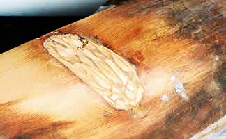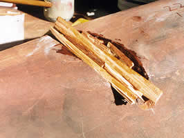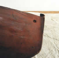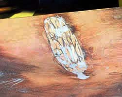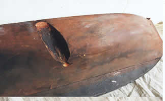 Most obvious was the large loss of fabric in one quarter. This was the result of a large knot having fallen out after the boat had been carved. Its not clear to me why Paxton bothered to finish a hull which had so obvious a flaw, let alone attempted to repair it. When I had the boat the knot was adhering by the very last thread of glue where an attempt had been made to refit it. I dont think it had ever been a satisfactory job, so I decided to fill the void with new wood, epoxy and cellulose filler. The photos show the sequence.