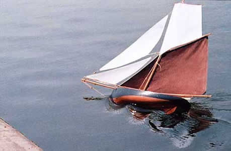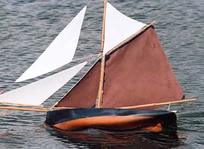 An error that was not so obvious until I was well on into the job was an off centre mast hole in the deck. This was only discovered when I had made a mast tube with a wooden plug shaped to fit the quite sharp angle between the two halves of the hull. When it was tried for fit the mast had a pronounced set to port. It was fixed by opening out the deck hole and fitting a deck plate to hold the mast tube where it ought to have been. A matching mahogany plate was fitted round the head of the rudder tube. As the boat had a rudder tube and a projection on the lead to take a pin for the rudder post, she was clearly intended to have some form of steering. Though the original almost certainly had a weighted rudder, I had done that on earlier Paxton restorations, so decided to fit a simple reverse tiller gear. Once the hull was sound, the majority of the work was in the finish and the rig. The wood was cleaned up and the water based deck paint cleaned off; then the inside of the low bulwarks were stained and varnished, as was the slip of mahogany on the deck which represented the cabin. When it was quite dry all the varnished work was masked off and the deck painted a light grey. This was lined out in pencil. This was no more than straight fore and aft planking with no attempt at waterways or joggling. This is a cheap toy boat, not a work of art. The deck was given a couple of coats of satin varnish to provide a contrast to the brightwork. The hull was given several coats of primer and undercoat before being painted black. The underparts were painted in Humbrol Old Bronze with a little black added. This gives a suitably tired looking coppered finish. The rig clearly had to be a gaff cutter and I made the lower sails (mainsail, fore staysail and jib) from cotton using the system I have developed for those who cant or wont sew. (There will be a full exposition of this method as an annexe to Ralph Nellists much more serious and truly vintage methods described in the forthcoming Curved Air Press publication Ralphs Guide to Vintage Sailmaking. I hope this will be on the streets later in the year. Ralph has delivered his text and the design of the book is in hand.)
