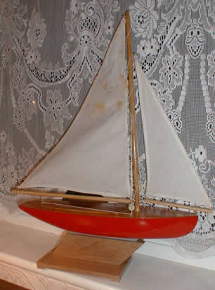 W384 I am looking for information on a old boat I bought about 6 months ago. It was in a mess but complete except for the booms for both sails,. A commercial model I think, 14" long 4.5" beam overall height keel to top of mast 19". The hull is solid and hollowed out under a deck cover, the deck is varnished over plank lines and the hull red with a silver painted steel fin. There is a small stencil on both sides of the mainsail near to its apex which is W384 over SL. I have attached a photo. if you could identify it I would appreciate it. TB