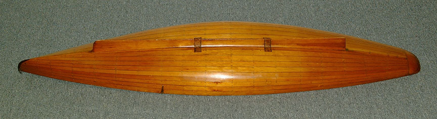 "My guess is that it is a designer or builder's model of a Sonder boat, possibly to help find the proper keel placement. The Sonder class originated in Germany in the late 1890's as a "poor man's" racing class with a mandated upper limit on cost. The first US Sonder boat was built in 1902. The class was popular in the Marblehead area, and international races between Germany, the US, and Spain were held up until WWI. The rating rules were: