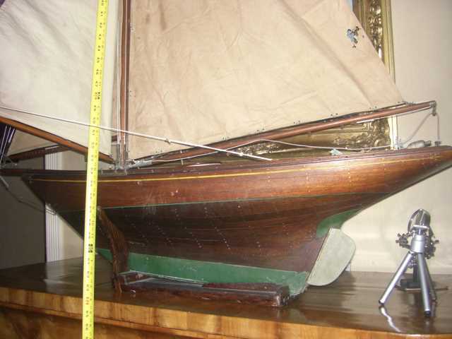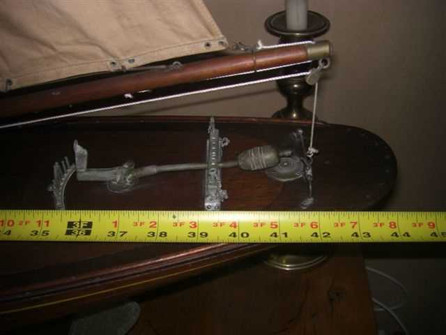 I recently inherited the "Mary", as pictured. I have since discovered she is called a Pond Yacht. Her provenance is hazy, having come from either a great grandfather who was a ship owner and boat builder in the late 1800's, or perhaps a toy given to the grand father in the 1920-30's. The hull is planked and fastened with screws to the ribs, with a heavy lead keel with handle inside the water tight hatch. The fittings are very fine and detailed and the sheets and tiller arrangements indicate that it was built as a sailing model and is closer to being a museum piece rather than a toy. It is a large model with a 54" mast and is 44" LOA. Any information you may have regarding it's possible origins would be appreciated. Reply: It's a bit of a poser, because the hull is clearly 19th century, but the rig is much later, probably between the wars. I should like some further information to help sort it out and to decide whether the boat was built to one or other of the Rating Rules that model yachtsmen used at the end of the 19th century. You can see the options in the Rules pages of our web site. http://www.vmyg.org.uk/class_rules.htm Can you tell me please what the beam of the boat is. It looks to be quite substantial and probably too wide to fit into the '1730' Tonnage Rule, which produced a very narrow 'plank on edge' hull. On the other hand if it's a boat to the LSA Rule, the hull form is rather untypical and probably dates from the very early years of modellers' use of the Rule, as they were transitioning from the '1730' to the LSA rule in the early 1890s. The steering gear also suggests that sort of period, though it is of a type that I had not seen before until the day before your boat turned up, when a pair of boats with very similar gear were offered on Ebay. It is of course possible that the boat was not designed to a class Rule, though vey few as large as this were built without some competitive aim in view.