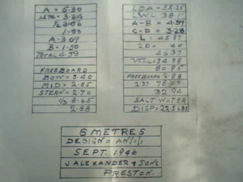 sold fittings as well as putting them on the boats he built. From Graham Reeves: At 55.5" long this may be an 18 footer re-registered as a 6 metre. 55.5" is a bit short for a Alexander 6 metre. Also I think most of the Alex 6's had a larger fin than Nigels boat JB I think