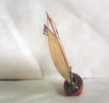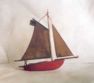 An Advertising Oddity I normally find myself trying to answer the questions in this section, but now I am seeking information from all you passing visitors to the VG site. The attached illustrations are of a very small (loa 1.5 inches) model made from very thin card and paper. I don't know where it came from. I found it when I was tidying the workshop and have completely forgotten how I came by it The hull and deck are die pressed and cut from card. The hull is shaped so that the boat will 'heel' when placed on a flat surface. The deck has an elegant pierced fantail extending beyond the transom. The sails are from paper and have the cloth seaming printed on them. The main also has a printed message that is now too faded to read, except for a few words, one of which is 'Christmas'. The mast, which was tapered, and the spars were originally made from very fine metal tube that was rolled from the flat, with the edges of the main sail enclosed within the slot. The mast was broken and has been replaced with wood as has the bowsprit. The boom retains its original arrangement and you will see that there is an eye for the main sheet formed in the metal. There is a wire horse for the main sheet and a wire representation of a tiller. These had disappeared and have been replaced. The hull was originally in natural brown card, the red paint is my addition This must have been a relatively expensive item to produce. The hull and deck need special die tools and the metal masts use a technique that would have called for special tooling also, yet it seems to have been a seasonal advertising novelty. Though the text is in English the flag on the leach of the main sail is not. It is a tricolour, but with the colours arranged in a way that represents no actual national flag, either now or in the early years of the 20th century, when I should think that it was produced. Anyone who has any suggestions as to what it really is, when it was produced and for what purpose, please email me Russell Potts