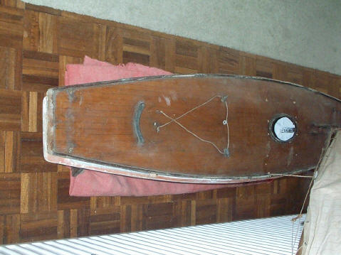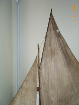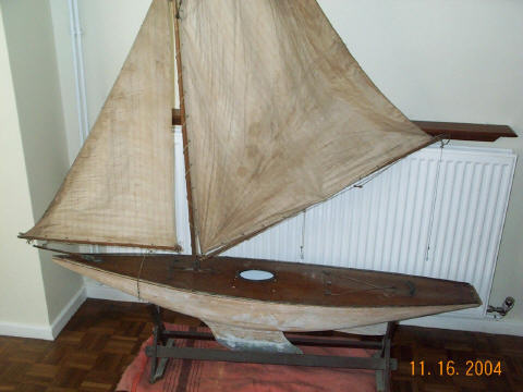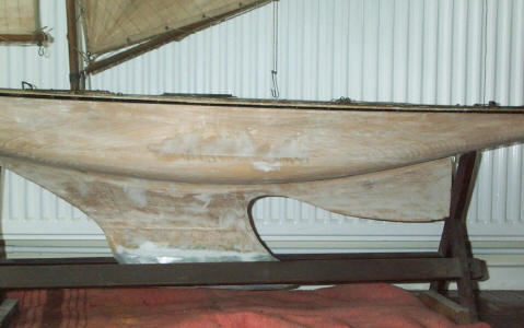 Taw Firstly a brief history of the boat. I purchased the model from a school friend in 1939/40, it was one of three of which had been given to him by an uncle, this is why I'm not 100% sure the sails are correct. I used to sail it in a local pond in Nth. London until about 1946, since then it has been stored in my loft wherever I resided. Last year the family suggested that I should refurbish it so I thought I had better check the hull for leaks, as a consequence when placed in the pond it duly sank, due to the adhesive of the bread and butter construction breaking down and the joints opening up, these subsequently closed on drying out.The deck warped quitte badly and had to be removed, and now requires replacing. Removing the deck has enabled me to reseal the hull and strenghten it with fibre glass matting