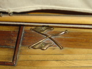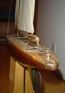 Crossed flag emblem This pond yacht is believed to be circa 1915 , mahogany planked hull with pine plank decking. Interesting brass emblem on deck representing crossed flags.