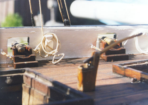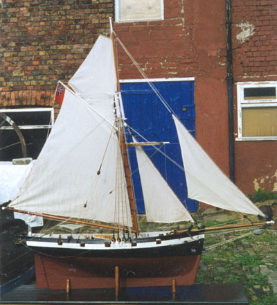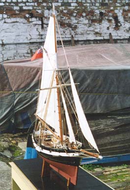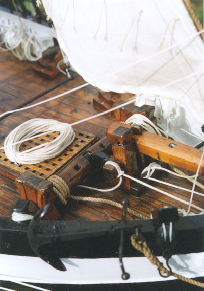 A very early sailing model is preserved in Deal on the channel coast near Dover. It is a 10-gun naval cutter built in the town by Henry Wyse Harvey between about 1831 and 1836, and sailed behind the beach "where the sea overflowed." Documentation comes in the form of a note written hurriedly in April 1908 by Henry's son Frederick, who had been laid in the unfinished hull as a baby. The note, found stuffed into the hull during restoration in 1970, records when, where, and by whom the model was built, where it was sailed, and other information. Henry Harvey was a junior member of an important naval family rooted in the area. His grandfather died a national hero after the Glorious First of June, 1794, and has a monument in Westminster Abbey. Six of Henry's uncles and first cousins became Admirals, and his brother John and son Frederick invented one of the first torpedoes tried by the navy. At least 20 other members of the family followed naval careers or married naval officers between the 1750s and the 1880s. Henry served as a midshipman, and although promoted lieutenant in 1819, never obtained a commission and was evidently content as a private gentleman. He was for a while Mayor of Deal. Henry's cutter is almost five feet long overall and has a beam of fourteen inches. It is a working model, on which sails could be set or reefed as required. Features like the windlass and the pump were fully functional and even the guns could be charged with powder and linked with a slow match to "fire a salute" under sail. The cutter has a deepened hull with a lead keel, and its form and rig were slightly simplified. The tiller was ingeniously controlled with ropes run through eyebolts in either bulwark to a bullet sliding across the deck. Captain John James Watts, a retired army officer living with the family, assisted with the project. Watts had a workshop at the house and was presumably a gentleman amateur woodworker. He probably moved out in 1833 when chosen by the Duke of Wellington to be Captain of nearby Walmer Castle - his personal assistant as Lord Warden of the Cinque Ports. Brass sheaves (and no doubt other metal fittings) were made by able seaman James Butler, servant to Henry's brother John since the beginning of his naval career in 1804. Butler was a remarkable individual known to have built a fully operative model of a corn mill four feet high. The "ladies of the family" made sails for the cutter and even young Frederick helped make rope. Little is known of the model's subsequent history, but it appears to have fallen into poor repair before being restored a little clumsily with shop bought fittings for use as a sailing model. It seems likely that Frederick's 1908 note was written for a new owner, and that this person was the restorer. Later the cutter was given to the Corporation of Deal to join a display of model boats in the Town Hall, but this collection was removed after a fire in the 1930s and lost. Some of the models were found in a garage in the late 1960s. Again in poor repair, Henry's cutter was restored locally as a static exhibit for the town's museum in the old Time Ball Tower, the last remnant of the Navy Yard. Shortly before the Corporation was abolished 1973 this entire collection was given to the Local History Society, in whose Maritime Museum it is to be seen today.