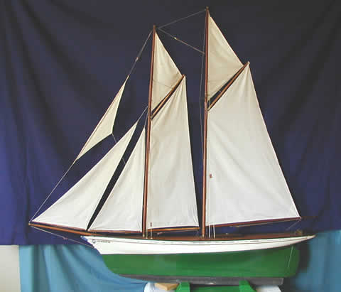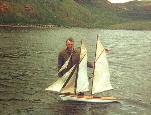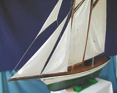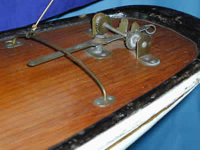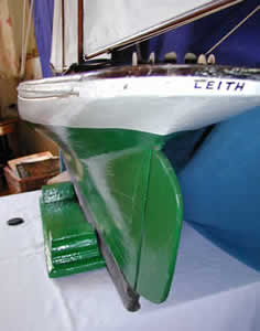 She has a blue painted figurehead (it looks to be gold beneath) with the name and a shield depicting St Andrews Cross on each bow. The 'Port of Registry' LEITH is on the stern. She measures just over 57 inches on deck excluding bowsprit and weighs 17 ½ lbs plus another 20lbs lead ballast, held in place by three brass lugs and machine screws. Originally she had lead weighted rudders, subsequently linked to a Clyde steering gear with brass wheel adjustment. Remarkably St Andrew has only had four owners in over 116 years. In 1928 she was purchased by the SPENCE family from a secondhand shop just around the corner from where Mr Donaldson had lived. She was much enjoyed and in 1987 was sailed by Douglas Spence and her previous owner, Chris Mackenzie on St Margaret's Loch, with permission from the Royal Parks Authority to re-enact to the very minute her first recorded win of 1887. This was reported by Russell Potts in Model Boats. St Andrew was last sailed by Chris Mackenzie in July 2002 who is pleased to have recently passed on this very fine and historic vessel to a new home, where she is to be restored to her original three masted rig. Martin Bandey