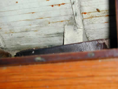 Her construction is of yellow pine, planked, which appears to be edge fastened to the lower plank (some rust staining on the plank seams would suggest this) with the planking pinned to frames at about 5 or 6 inch centres, quite far apart unless the planking is indeed edge fastened. She has a detachable full length lead ballast keel which was cast for her later owners in 1947, copy of the Foundry invoice on record. Her present pine deck, which is lined, dates from 1942 when she was converted to a two masted schooner; her original sails and spars however still exist to this day.
