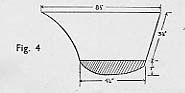 Having marked the points, trace a curve cutting the points. This is shown at A in Fig. 2. Turn the block over on its side and mark the corresponding depths as indicated in column 3 in the table. Trace the depth-curve as at B in Fig. 2, and repeat the process on the other side.A supply of thin cardboard is now needed to enable a set of templates to be cut out to correspond with the shapes at the various sections of the hull. These shaped pieces are used as guides when shaping the wood.Fig. 3 is a reduced drawing of the shapes at various sections. The on the right-hand side represent the shapes from the bow to the mid-section, while those at the left are those from the midsection to the stern. In setting out each outline should be traced on a separate piece of cardboard and then cut out with a pair of sharp scissors. Shaping the Hull.-Remove the waste from the bottom down to the curved depth lines on the sides of the hull, using a sharp, wide chisel for the purpose, and then remove the waste material round the deck lines.Mark a centre-line from bow to stern on the curved bottom of the hull and with a chisel pare off as much of the waste as possible, and finally obtain the correct shape by means of a spokeshave and the use of the templates, which should be tried at all sections as the work progresses. Rub the surface perfectly smooth with fine glass-paper As the next process consists of removing the waste from the interior of the hull, it is necessary to fix it down to a board having blocks to support the stem and stern. A flat board about 1 ft. 8 in. long by 6 in. wide and 5/8 in. thick should be selected. Make a centre-line down its length and drill two screwholes near the middle and drive a couple of 1-in. screws from the underside of the board into the bottom of the hull. The screws should be accurately centred so as to come in the portion of the hull where the keel-plate will be fixed. Shape a couple of blocks to correspond with the curved end sections of the hull, line them with felt or other soft material to prevent bruising the hull, and place them firmly in position.Now fix the base-board with the hull to the top of the bench, using screws for the purpose. Run a guide-line parallel to and 1/4 in. from the outside edge of the deck-curve and then remove as much waste as possible with a brace and bit, finishing it off with a sharp gouge. Great accuracy is not required, as the interior is hidden by the deck. This completes the most difficult part of the model. The Keel.-Shape out the keel-plate, which is 3/8 in. thick, as indicated in Fig. 4,not forgetting to form a sharp edge at the front to cut the water. The lead at the bottom of the keel can be cast at home by first making a plaster-of-Paris mould and then pouring the molten metal into it, and when cool, finishing it off with a file. The lead is then fixed to the bottom of the keel plate by means of long, thin nails, drivenin after the metal has been drilled to receive them.A 3/8-in. wide slot should now be made at the bottom of the hull to take the keelplate, and the plate inserted into the groove and secured with screws driven in from the interior of the hull. The Rudder.-Drill a 1/4-in.-diameter hole in the hull to take the stem of the rudder, and then make the rudder from a strip of wood 1/8 in. thick. The rudder should be painted to match the hull and fitted after the deck has been fixed. Give the exterior another rub down with fine glass-paper and then apply a coat of gold size to fill up the pores of the wood, before painting. When dry, apply a thin coat of flat paint-that is, a paint without gloss-and then give a finishing coat of good quality gloss paint or enamel of the desired colour. A dark-coloured band about 5/8 in, deep should be made below deck-line and the lead keel also painted black in order to give the hull a good finish. The Deck consists of a piece of 3/16-in. thick pine. The wood should be cut out to follow the curves of the deckline of the hull, allowing 1/16-in. overlap all round. Smooth the deck with fine glass-paper, round the edges, and draw neat pencil-lines 1/4 in. apart to represent joints in the planks. Give the deck a coat of gold size, followed by a coat of good varnish. The Mast. Bore a 3/8-in. hole in thecentre of the deck, 6 1/2 in. from the bow, to take the mast. Then fix the deck to the hull by means of fine brass brads, taking great care not to split the wood. The mast consists of a piece of dowel rod, 15 in. long, 3/8 in. in diameter, tapering gently from the foot upwards, while the bowsprit and boom are made of similar material. The gaff is 1/4-in. dowel. These parts should receive a coat of gold size and then varnish. The Sails should be made of best quality linen. Paper patterns must be prepared, allowing sufficient margin for the hems. When the sails are ready, rig up the yacht, using fishing line for the lines and halyards. The shapes of the two sails are shown in Fig. 1.The foot of the mast is fitted with a spike, consisting of a headless nail, which fits into the wood at the bottom of the interior of the hull. No. 000 brass screw-eyes are used at the sides of the deck for fixing the stays, while ordinary pins, bent to form hooks, are fastened to the ends of the stays to enable the mast, etc., to be removed as required.