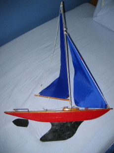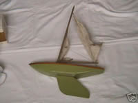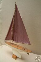 A classic Bowmans of Norfolk pond yacht in good original condition, ready to sail. With the stamp of Bowman racing yacht made in England Ridlington Haisbro Norfolk. Measures 25.5" deck to top of mast. 4.25" beam. 22" long and 25.5" deck to bottom of keel. March 2005 Fetched £7 Hull only of a vintage model racing yacht by Bowman of Ridlington, Haisboro, Norfolk. Project for the enthusiast, this is just the hull, no mast, spars or rigging. The dimensions are (approx) length -600mm, beam 110mm, depth to keel 55mm, Keel depth 115mm. The hull is solid timber and the keel is steel. Some pin holes in deck from previous rigging etc., I believe this model dates from the 1920s (internet research) March 2005 Fetched £4.20 Bowman Racing Yacht in fair condition sails are a little twisted but I'm sure they can be sorted by a patient person
